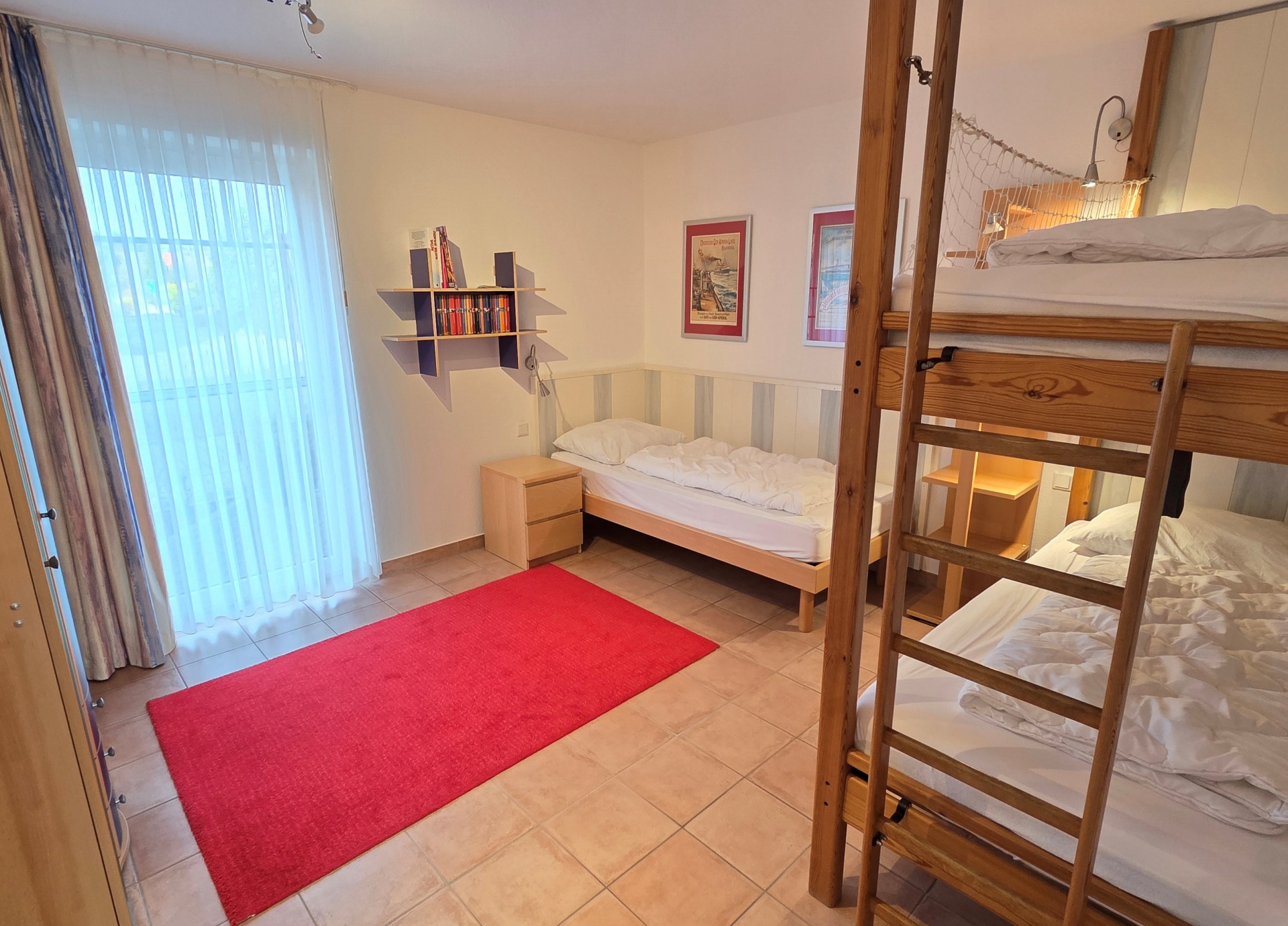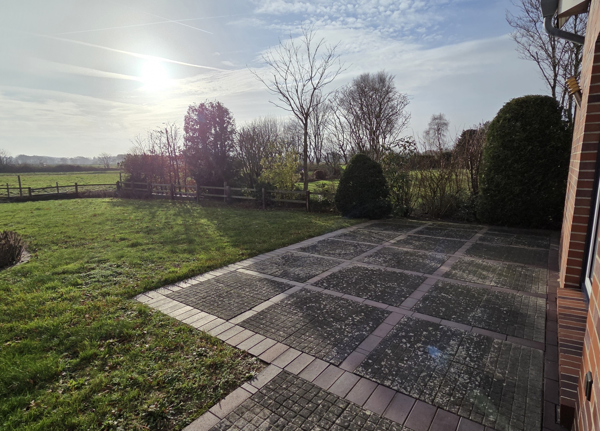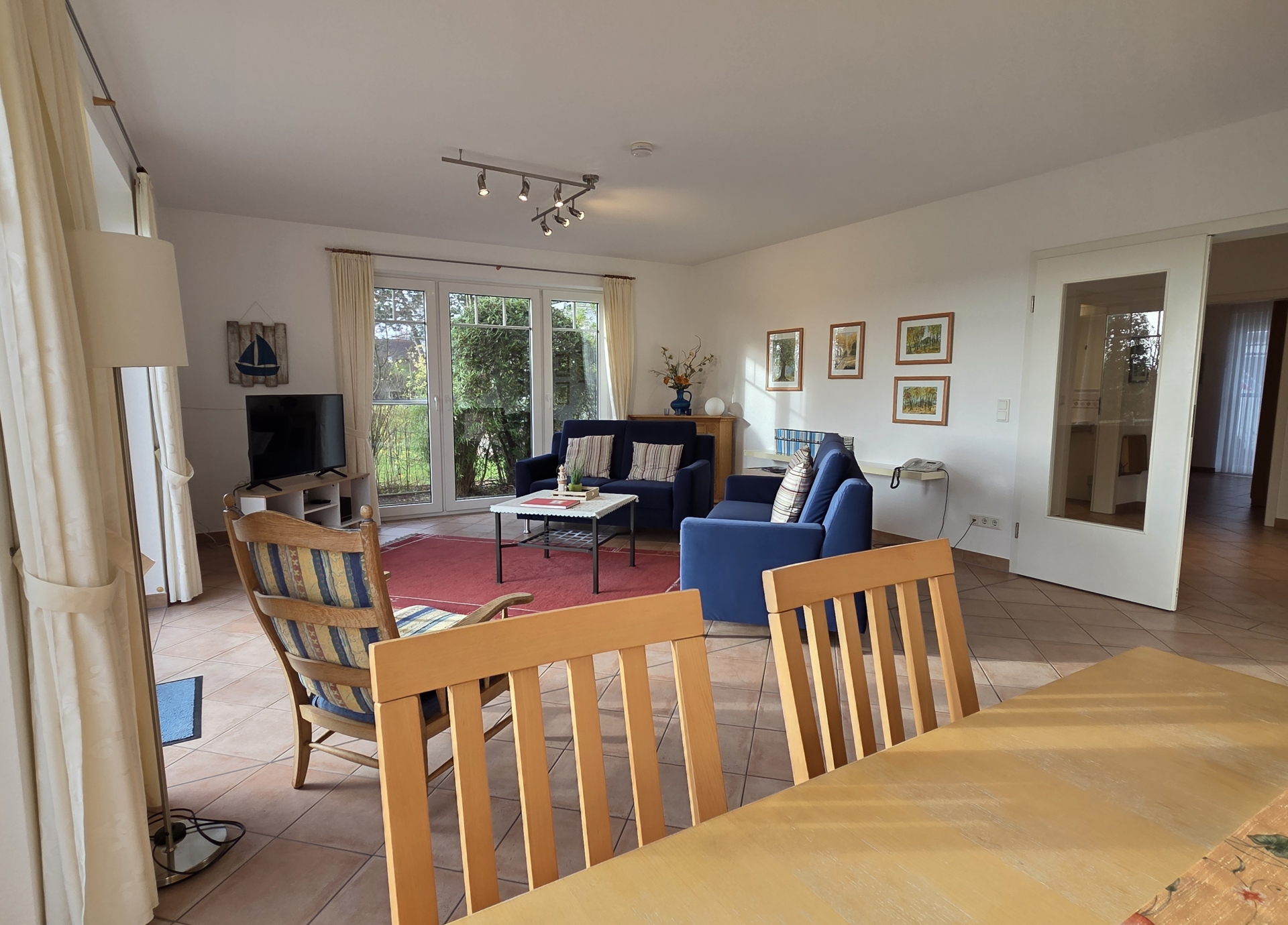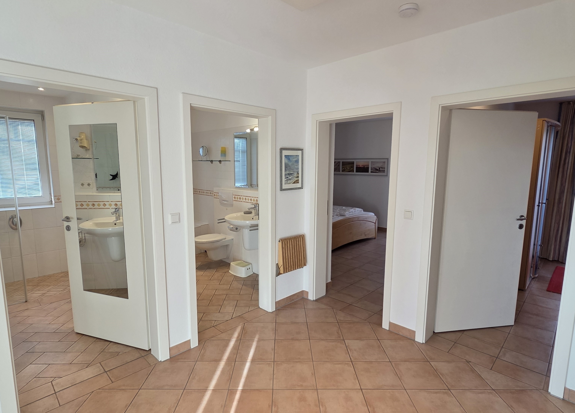 Wohnfläche: 84,20m². Bereits beim Betreten empfängt Sie die Wohnung mit einer großen, offenen Eingangsdiele, von der aus Sie alle Räume erreichen. Die moderne Wohnung ist vollständig mit hellen, terrakottafarbenen Fliesen ausgestattet, was für eine gemütliche und einheitliche Atmosphäre sorgt. Durch eine zweiflügelige Tür mit Glaseinsätzen gelangen Sie in den großzügigen, lichtdurchfluteten Wohn- und Kochbereich, der vor allem durch seine großen, bodentiefen Fenster überzeugt. Von hier aus erreichen Sie zudem die sonnige Süd-Terrasse mit Garten und weitläufigem Blick über Wiesen und Weideflächen - ein idealer Ort, um zahlreiche sonnige Stunden mit Freunden oder der Familie zu genießen. Über die Eingangsdiele gelangen Sie außerdem zu den beiden Bädern der Wohnung. Beide verfügen über ein WC sowie ein Waschbecken. Eines der Bäder ist mit einer bodentiefen Dusche ausgestattet, das andere mit einer Badewanne. Die letzten beiden Zimmer der Wohnung sind identisch groß und gespiegelt angeordnet. Sie eignen sich sowohl als Schlafräume als auch als Gäste- oder Büroräume.