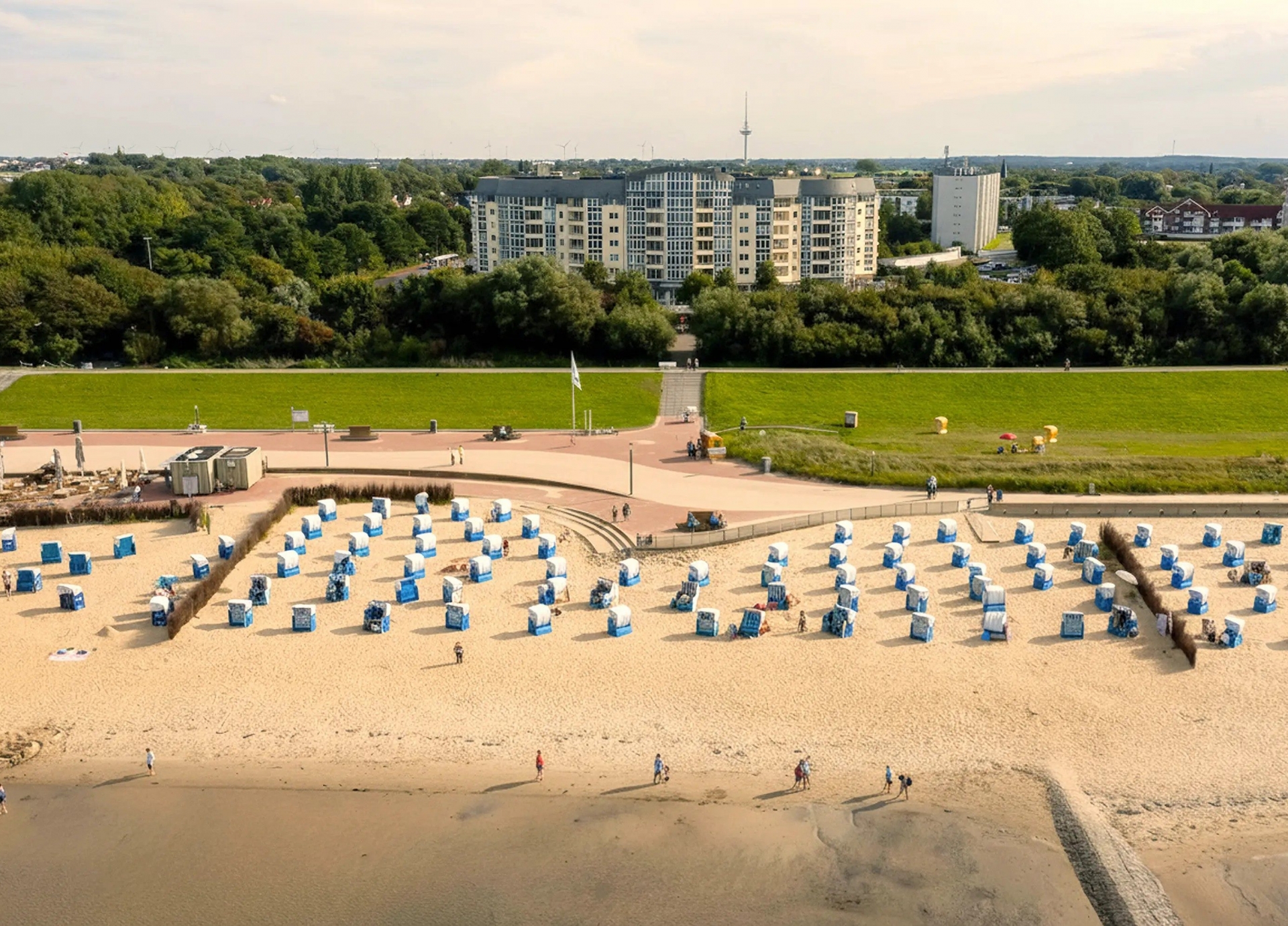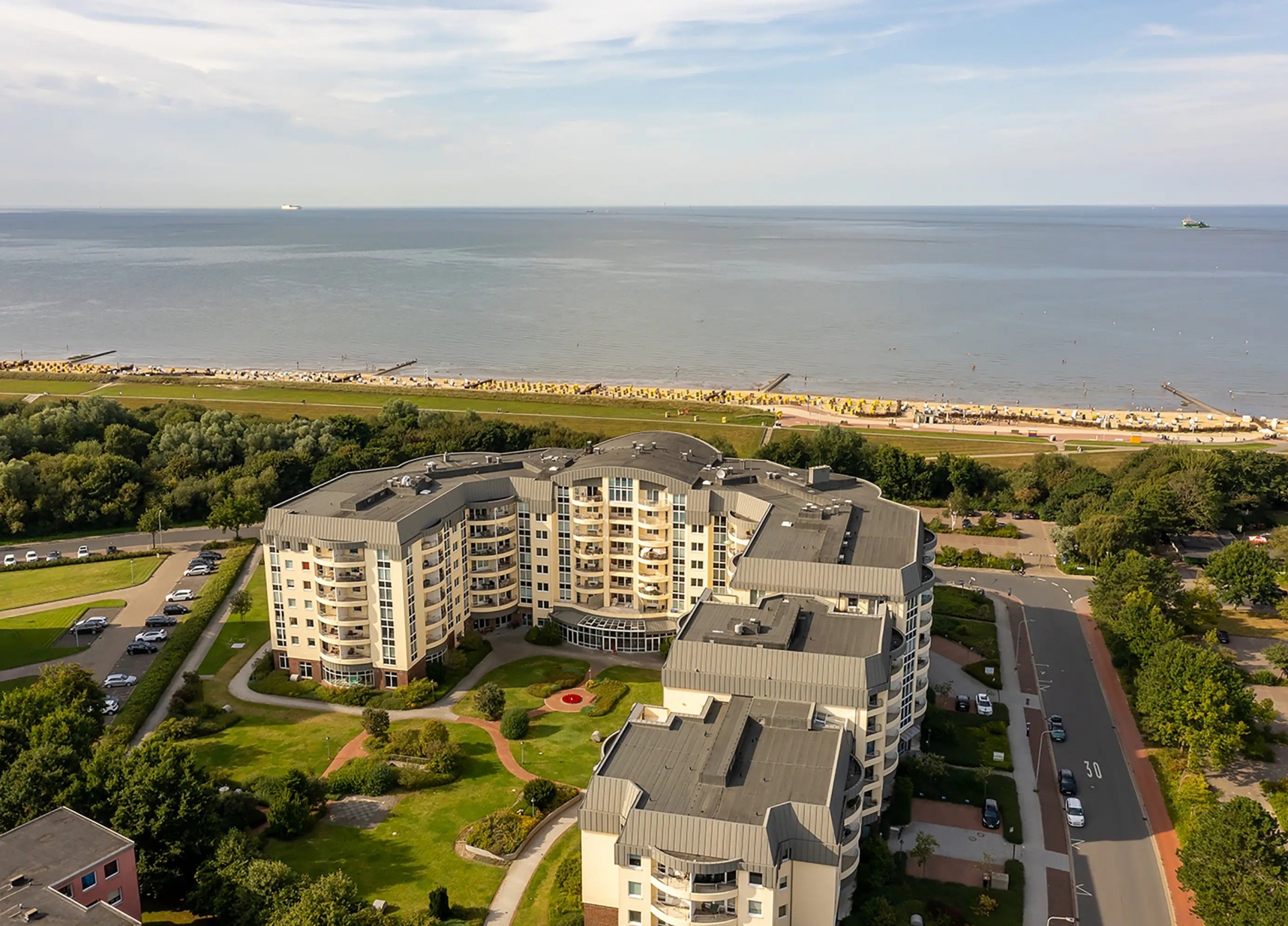 Das Gebäude liegt im Stadtteil Döse, unweit des Strandes und der Kugelbake, einem jahrhundertealten Seezeichen, welches den Übergang der Elbe in die Nordsee markiert. Das Besondere daran? Die weltgrößten Containerschiffe und Kreuzfahrtschiffe passieren dieses Wahrzeichen nur einen Steinwurf entfernt. Für die Eigentümer der Penthousewohnung ist es mit einem kurzen Spaziergang erreichbar. Unweit von der Kugelbake liegen die Grimmershörnbucht und der Kurpark mit der Kugelbakehalle, in der ganzjährig Kulturveranstaltungen stattfinden. Aber nicht nur diese Orte sind schnell erreichbar. Vor dem Haus befindet sich ein feiner Sandstrand, der sich kilometerweit von der Haustür über Duhnen bis nach Sahlenburg zieht. Auch in der Kurpark Residenz selbst gibt es umfassende Angebote, die den Alltag bereichern: Von Swimmingpool bis hin zur E-Bike-Ladestation und Fitnessstudio findet sich dort alles, was zum Wohlbefinden beiträgt.