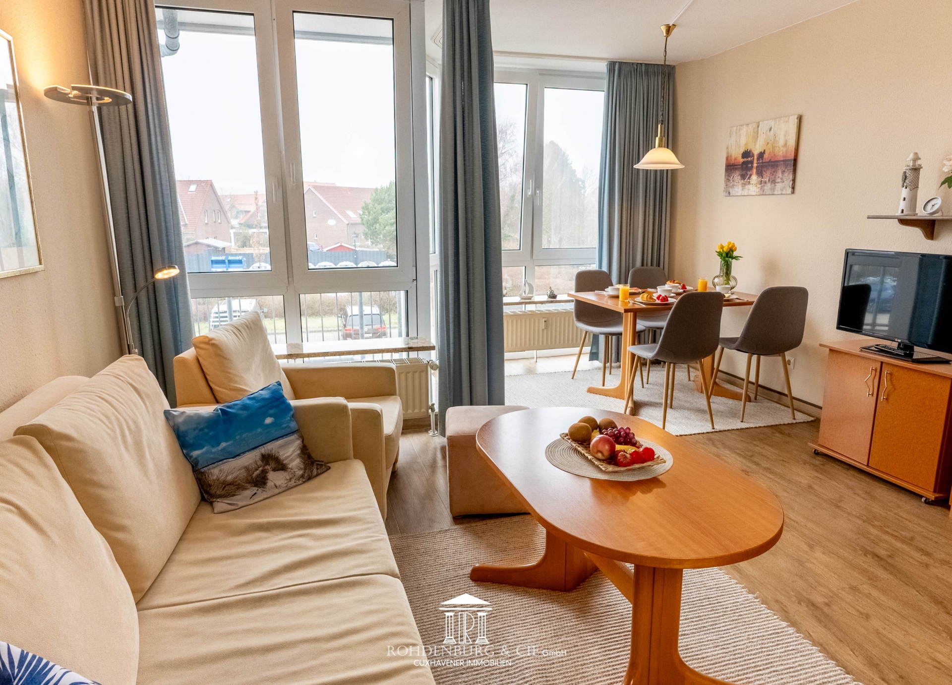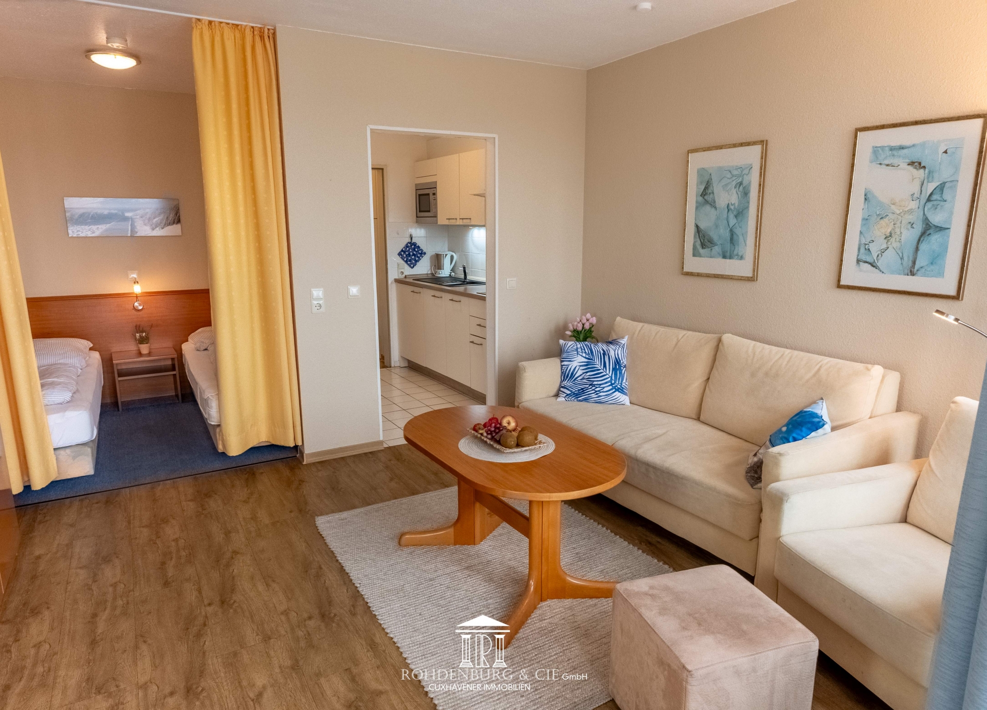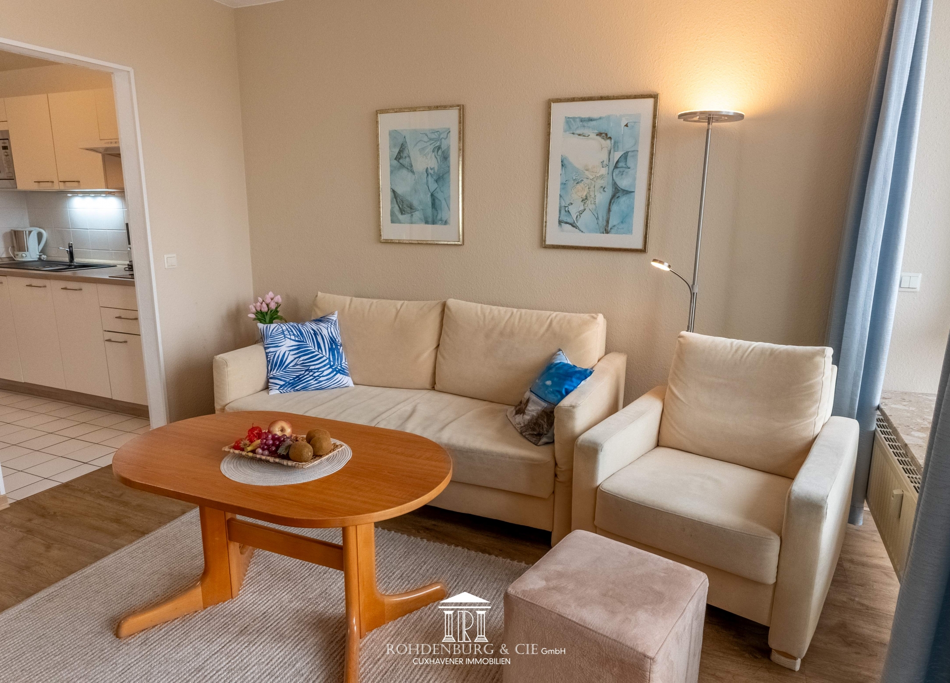 Diese liebevoll gestaltete 1-Zimmer-Eigentumswohnung im 1. Obergeschoss des Hauses Knechtsand überzeugt durch ihre durchdachte Raumaufteilung auf einer Wohnfläche von 34,45 m². Aktuell wird die Wohnung im Rahmen zeitweiliger Vermietung an Feriengäste genutzt. Trotz ihrer kompakten Größe vermittelt sie ein überraschend großzügiges Wohngefühl und schafft ideale Voraussetzungen für entspannte Tage in Duhnen. Das Herzstück der Wohnung bildet der offene Wohn- und Essbereich, der durch bodentiefe Fenster und einen charmanten Erker besonders lichtdurchflutet und einladend wirkt. Der großzügige Raum bietet ausreichend Platz für einen Esstisch, an dem Gäste willkommen sind, sowie für eine gemütliche Sitzecke, in der Sie entspannte Stunden verbringen können. Vom Wohnbereich gelangen Sie direkt auf den kleinen, geschützten Balkon – perfekt für ein Frühstück in der Morgensonne, ein Glas Wein am Abend oder einfach, um die frische Meeresluft zu genießen. Der Schlafbereich ist durch einen stilvollen Vorhang elegant vom Wohnbereich abgetrennt und verfügt über zwei komfortable Einzelbetten, die für Rückzug und Privatsphäre sorgen. Hochwertige Designvinylböden verleihen der Wohnung ein modernes, elegantes Ambiente, während ein Teppich im Schlafbereich zusätzlichen Komfort bietet. Die Wohnung verfügt über eine vor Kurzem modernisierte Einbauküche. Dank ihrer funktionalen Ausstattung, großzügigem Stauraum und reichlich Arbeitsfläche wird das Zubereiten von Mahlzeiten hier besonders komfortabel. Die Küche ist elegant in den Eingangsbereich integriert, sodass der Wohnbereich hell, offen und großzügig bleibt. Auch der restliche Eingangsbereich wurde optimal genutzt. Ein Einbauschrank schafft praktischen Stauraum, ohne den Wohnraum zu beeinträchtigen, und trägt so zu einem rundum komfortablen Wohngefühl bei. Das Badezimmer überzeugt durch seine schlichte und zeitlose Gestaltung und ist mit einer Dusche mit leicht erhöhtem Einstieg ausgestattet. Der elegante Fliesenboden sorgt für ein modernes Ambiente und ist besonders pflegeleicht. Ein eigener KFZ-Außenstellplatz und ein praktisches Kellerabteil runden das Angebot ab und sorgen für zusätzlichen Komfort und Stauraum. Aktuell wird die Wohnung erfolgreich über ein professionelles Vermietungsbüro an Feriengäste vermittelt, sodass der Erwerber unmittelbar von bestehenden Mieteinnahmen profitieren kann. Bereits gebuchte Aufenthalte sind vom Käufer zu übernehmen. Der bestehende Vermittlungsvertrag wird im Zuge des Verkaufs beendet, kann jedoch von den neuen Eigentümern bei Bedarf erneut abgeschlossen werden. Eine Änderung des Bebauungsplanes im Bereich der Nutzungsgenehmigung als Ferienwohnung wurde von Rat der Stadt Cuxhaven beschlossen, die Änderungsgenehmigung ist noch nicht erfolgt.