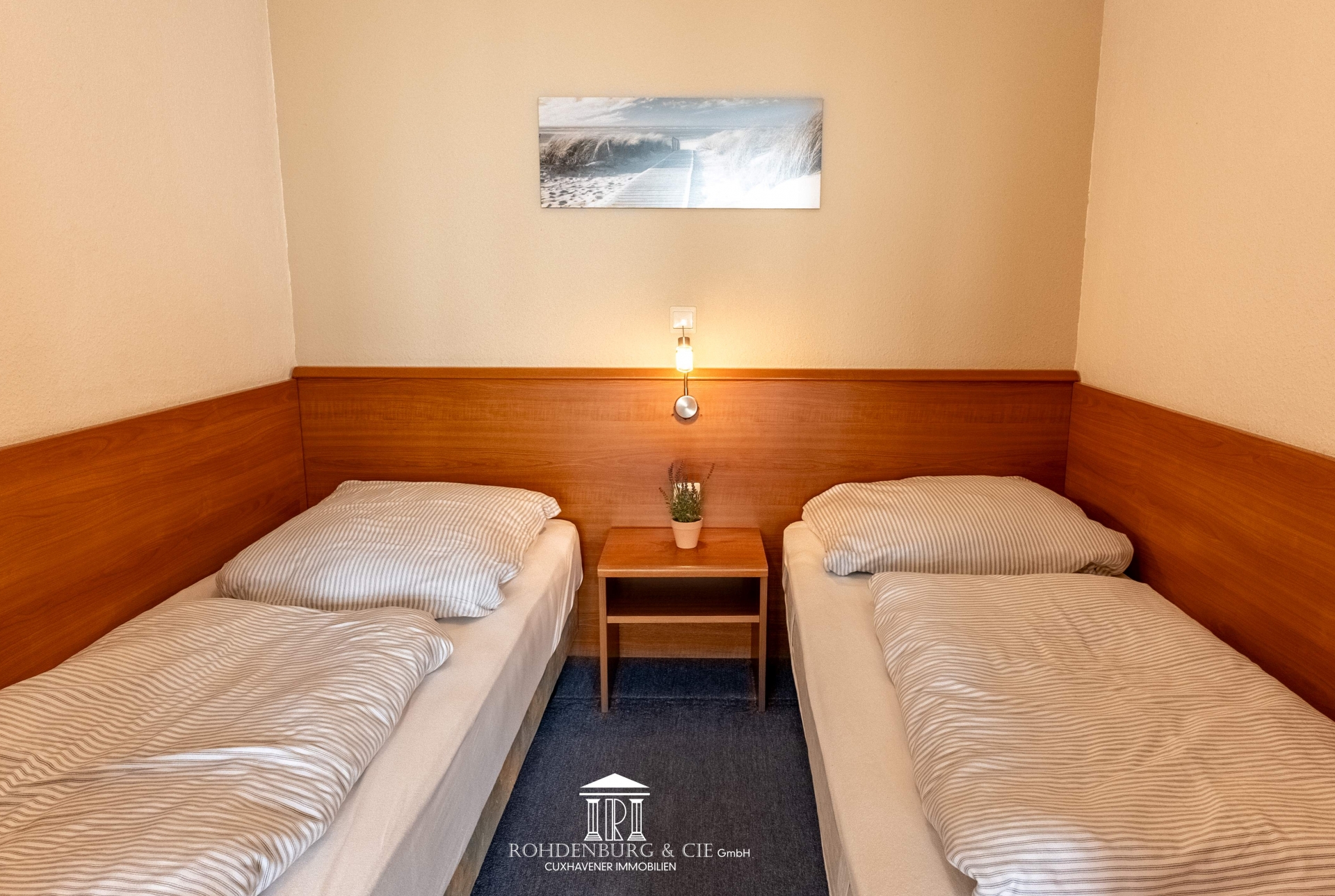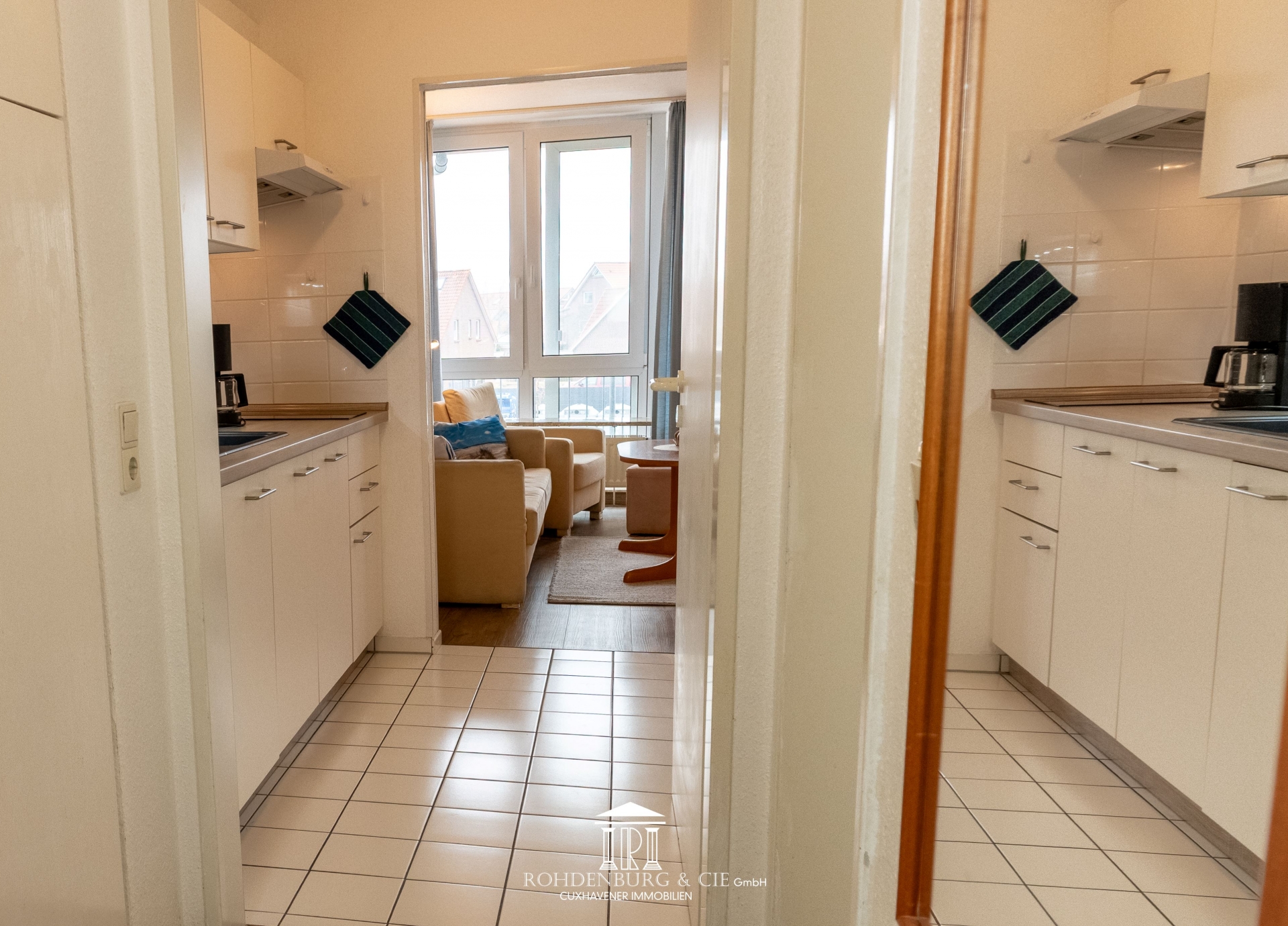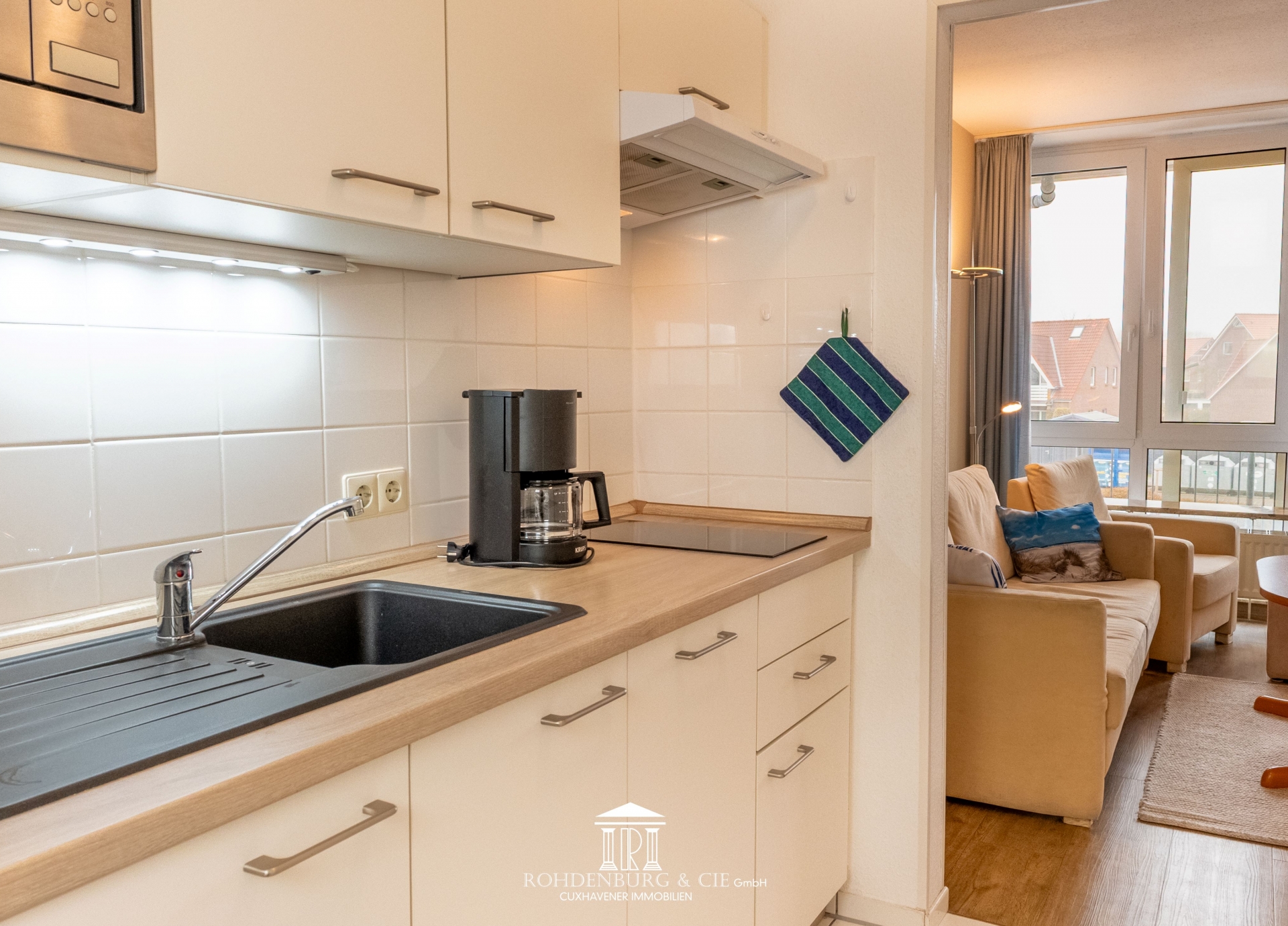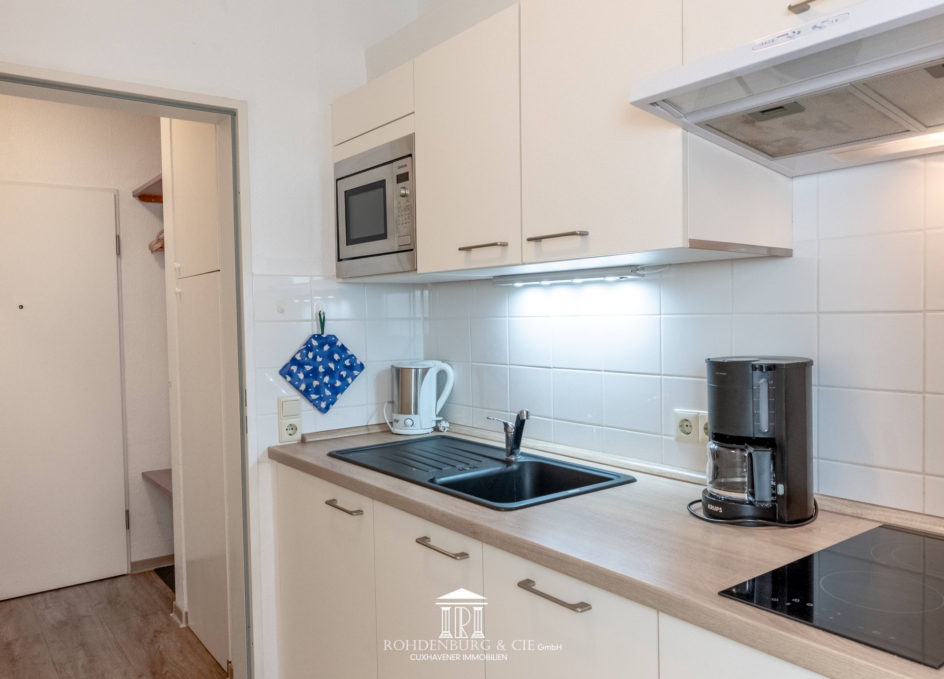 Diese liebevoll gestaltete 1-Zimmer-Eigentumswohnung im 1. Obergeschoss des Hauses Knechtsand überzeugt durch ihre durchdachte Raumaufteilung auf einer Wohnfläche von 34,45 m². Aktuell wird die Wohnung im Rahmen zeitweiliger Vermietung an Feriengäste genutzt. Trotz ihrer kompakten Größe vermittelt sie ein überraschend großzügiges Wohngefühl und schafft ideale Voraussetzungen für entspannte Tage in Duhnen. Das Herzstück der Wohnung bildet der offene Wohn- und Essbereich, der durch bodentiefe Fenster und einen charmanten Erker besonders lichtdurchflutet und einladend wirkt. Der großzügige Raum bietet ausreichend Platz für einen Esstisch, an dem Gäste willkommen sind, sowie für eine gemütliche Sitzecke, in der Sie entspannte Stunden verbringen können. Vom Wohnbereich gelangen Sie direkt auf den kleinen, geschützten Balkon – perfekt für ein Frühstück in der Morgensonne, ein Glas Wein am Abend oder einfach, um die frische Meeresluft zu genießen. Der Schlafbereich ist durch einen stilvollen Vorhang elegant vom Wohnbereich abgetrennt und verfügt über zwei komfortable Einzelbetten, die für Rückzug und Privatsphäre sorgen. Hochwertige Designvinylböden verleihen der Wohnung ein modernes, elegantes Ambiente, während ein Teppich im Schlafbereich zusätzlichen Komfort bietet. Die Wohnung verfügt über eine vor Kurzem modernisierte Einbauküche. Dank ihrer funktionalen Ausstattung, großzügigem Stauraum und reichlich Arbeitsfläche wird das Zubereiten von Mahlzeiten hier besonders komfortabel. Die Küche ist elegant in den Eingangsbereich integriert, sodass der Wohnbereich hell, offen und großzügig bleibt. Auch der restliche Eingangsbereich wurde optimal genutzt. Ein Einbauschrank schafft praktischen Stauraum, ohne den Wohnraum zu beeinträchtigen, und trägt so zu einem rundum komfortablen Wohngefühl bei. Das Badezimmer überzeugt durch seine schlichte und zeitlose Gestaltung und ist mit einer Dusche mit leicht erhöhtem Einstieg ausgestattet. Der elegante Fliesenboden sorgt für ein modernes Ambiente und ist besonders pflegeleicht. Ein eigener KFZ-Außenstellplatz und ein praktisches Kellerabteil runden das Angebot ab und sorgen für zusätzlichen Komfort und Stauraum. Aktuell wird die Wohnung erfolgreich über ein professionelles Vermietungsbüro an Feriengäste vermittelt, sodass der Erwerber unmittelbar von bestehenden Mieteinnahmen profitieren kann. Bereits gebuchte Aufenthalte sind vom Käufer zu übernehmen. Der bestehende Vermittlungsvertrag wird im Zuge des Verkaufs beendet, kann jedoch von den neuen Eigentümern bei Bedarf erneut abgeschlossen werden. Eine Änderung des Bebauungsplanes im Bereich der Nutzungsgenehmigung als Ferienwohnung wurde von Rat der Stadt Cuxhaven beschlossen, die Änderungsgenehmigung ist noch nicht erfolgt.