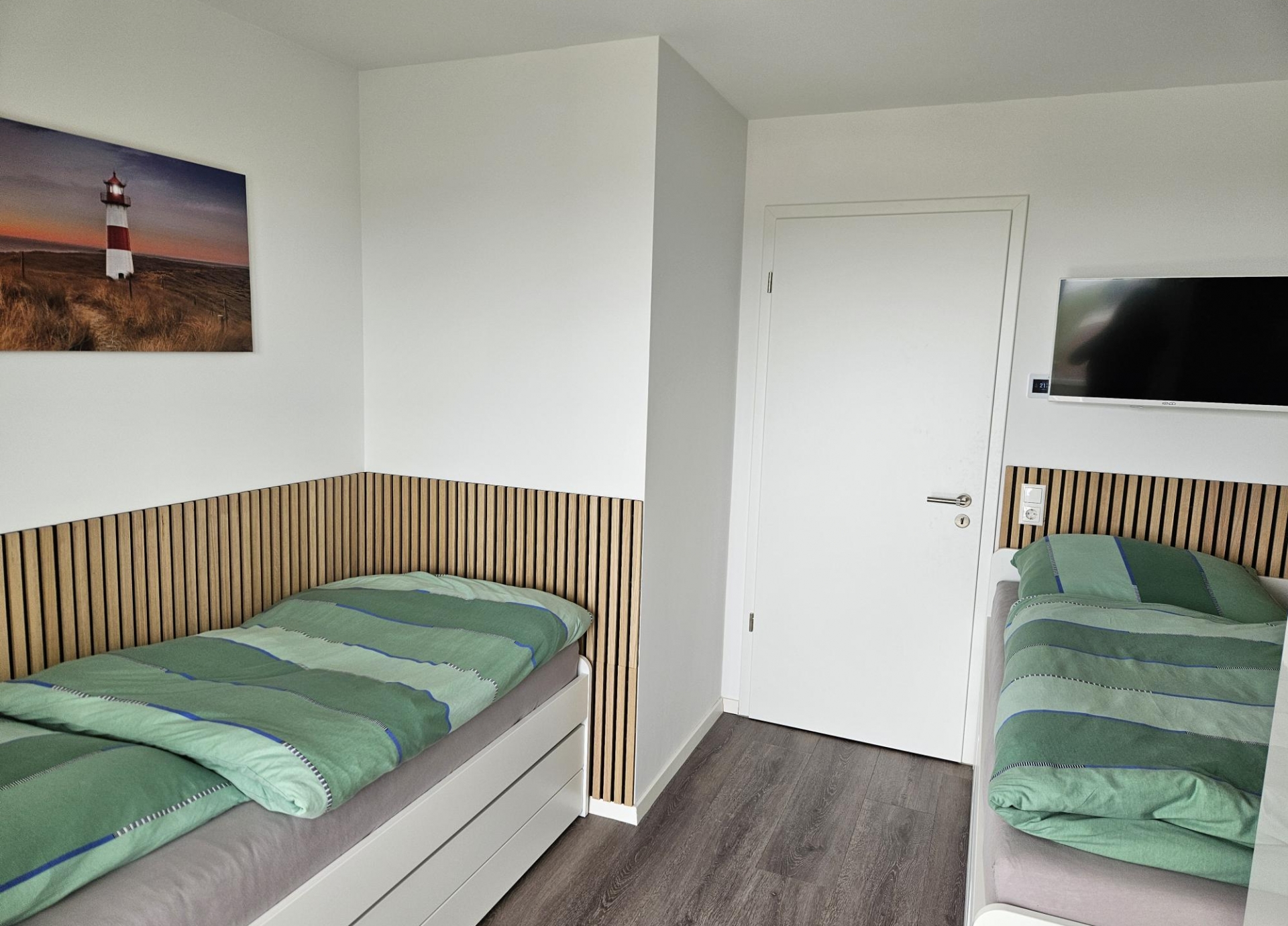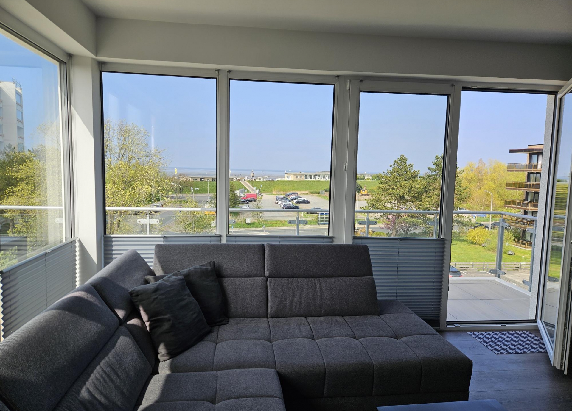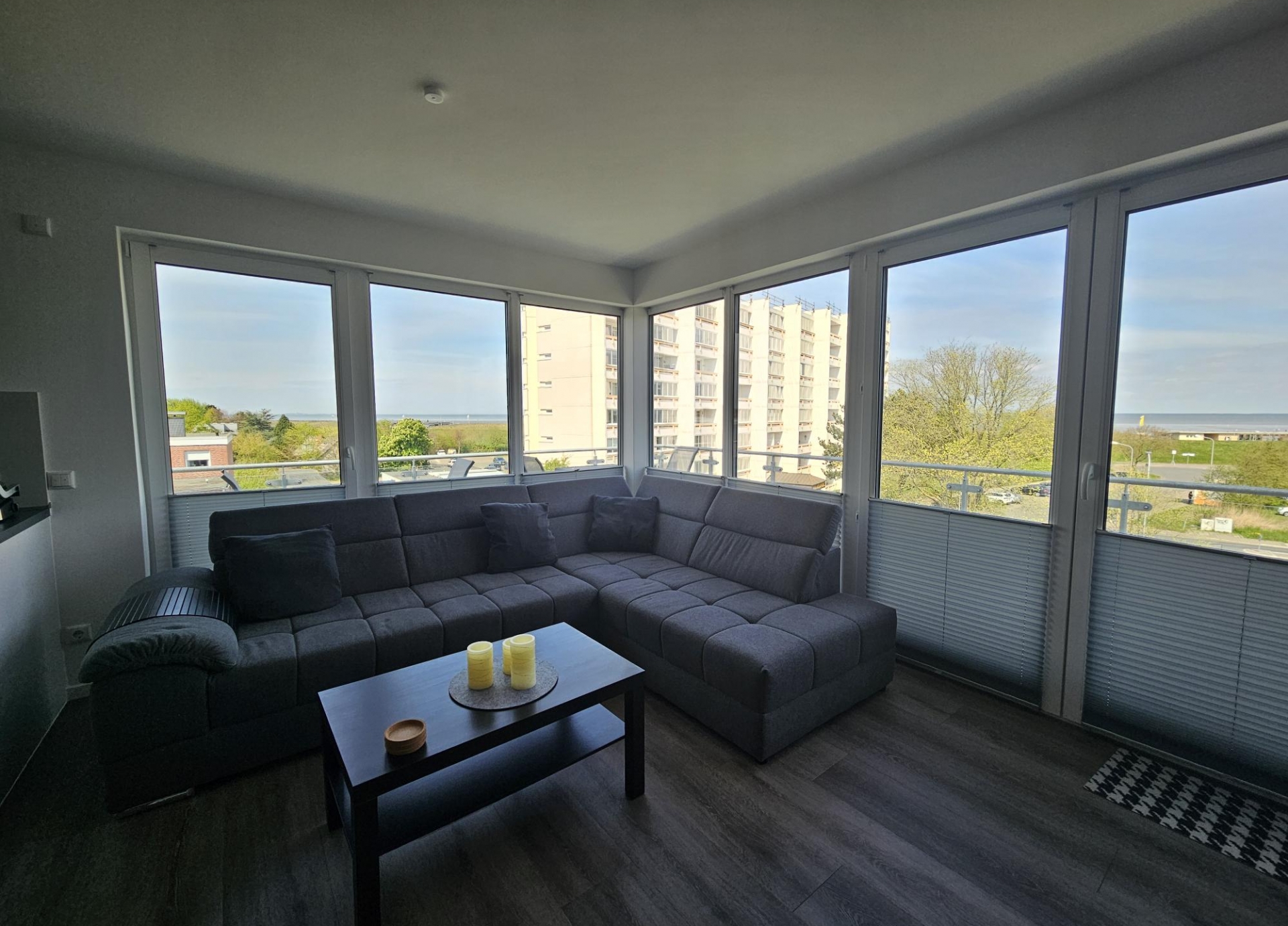 Diese vollmöblierte 3-Zimmer Neubauwohnung umfasst eine Wohnfläche von 81,27m². Sie befindet sich im 3.Obergeschoss einer modernen Neubauanlage und ist bequem über einen Aufzug erreichbar. Diese stilvolle Wohnung empfängt Sie mit zwei lichtdurchfluteten Schlafzimmern, die beide direkten Zugang zu einem sonnigen Westbalkon bieten - perfekt, um den Tag entspannt ausklingen zu lassen. Das großzügige Hauptschlafzimmer überzeugt mit einem komfortablen Doppelbett und einem geräumigen Kleiderschrank, während das zweite Schlafzimmer mit zwei Einzelbetten, einem Kleiderschrank und einem Fernseher vielseitig nutzbar ist - ideal für Gäste, Kinder oder als Rückzugsort. Das moderne Tageslichtbad ist in warmen, harmonischen Farbtönen gefliest und verfügt über eine bodentiefe Dusche sowie eine praktische Waschmaschine. Das Herzstück der Wohnung bildet der weitläufige Koch- und Wohnbereich, der durch seine großflächige Fensterfront zur Nordseite ein beeindruckendes Panorama mit Blick auf die Nordsee eröffnet. Die offene, hochwertig ausgestattete Einbauküche fügt sich harmonisch in das Wohnkonzept ein und schafft den perfekten Rahmen für gesellige Kochabende und genussvolle Stunden. Ein weiteres Highlight ist der zweite Balkon - ein großzügiger Eckbalkon in Nordwestausrichtung -, von dem aus Sie eine weitläufige Aussicht auf die Nordsee genießen und die maritime Atmosphäre in vollen Zügen erleben können. Diese Neubauwohnung vereint modernen Wohnkomfort mit einer hochwertigen Ausstattung und einer stilvollen Einrichtung. Mit zwei Balkonen, einer durchdachten Raumgestaltung und einem harmonischen Wohnkonzept bietet sie den idealen Ort zum Wohlfühlen. Die Wohnung eignet sich besonders gut für Pendler oder Berufstätige auf Zeit, da auf Wunsch auch ein befristetes Mietverhältnis, beispielsweise über sechs Monate, vereinbart werden kann.