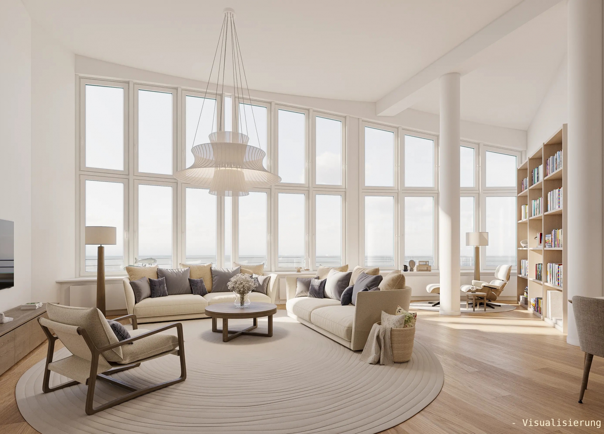 - Penthouse im 7.Obergeschoss - 3 Zimmer mit grenzenloser Freiheit auf 173m² - 80m² Wohnraum mit einer Deckenhöhe bis 4,70m - Unverbaubarer Blick auf Elbmündung und Nordsee - 150m zum eigenen Strandkorb Dieses außergewöhnliche Penthouse in der angesehenen Kurpark Residenz in Cuxhaven, direkt am weitläufigen Döser Sandstrand, bietet etwas ganz Besonderes: Durch das knapp 20 m² große Panoramafenster im 7. Obergeschoss schweift der Blick auf die Nordsee, von Neuwerk bis zur Kugelbake, und offenbart einen außergewöhnlichen Blick auf Strand, Meer und bildschöne Sonnenuntergänge. Separiert von den anderen Wohneinheiten und im Aufzug mit Express-Transfer zum Strandausgang und in Ihr Penthouse bietet dieser besondere Ort nicht nur einen Platz der Ruhe und Erholung.